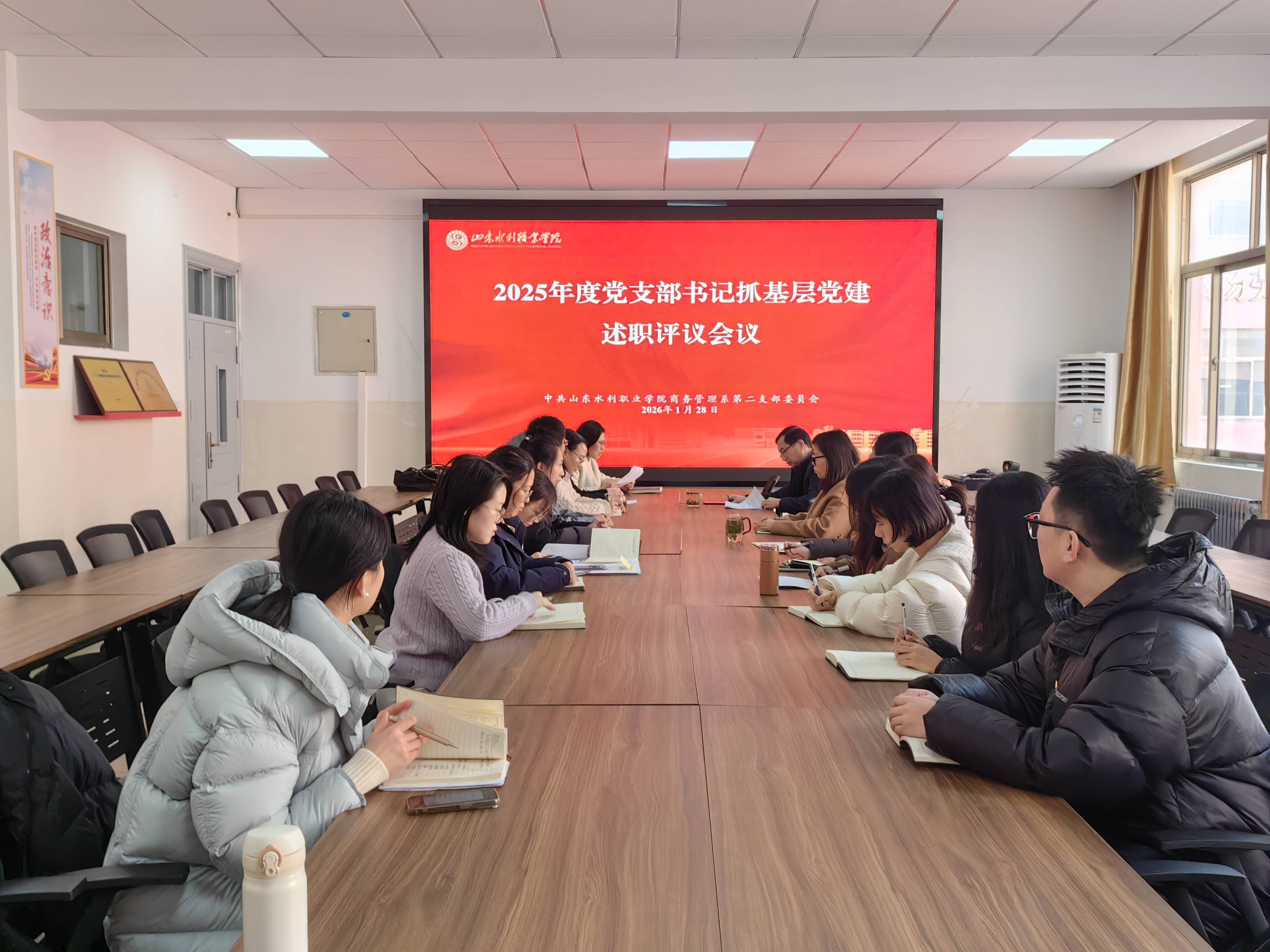 为切实压实基层党建工作责任,推动党建与业务深度融合,进一步强化基层党组织政治功能和组织功能,夯实党建工作根基。1月28日,商务管理系开展2025年度党支部书记抓基层党建述职评议工作。第一党支部书记张蒙蒙、第二党支部书记周颖分别主持所在支部会议,全体党员参加。