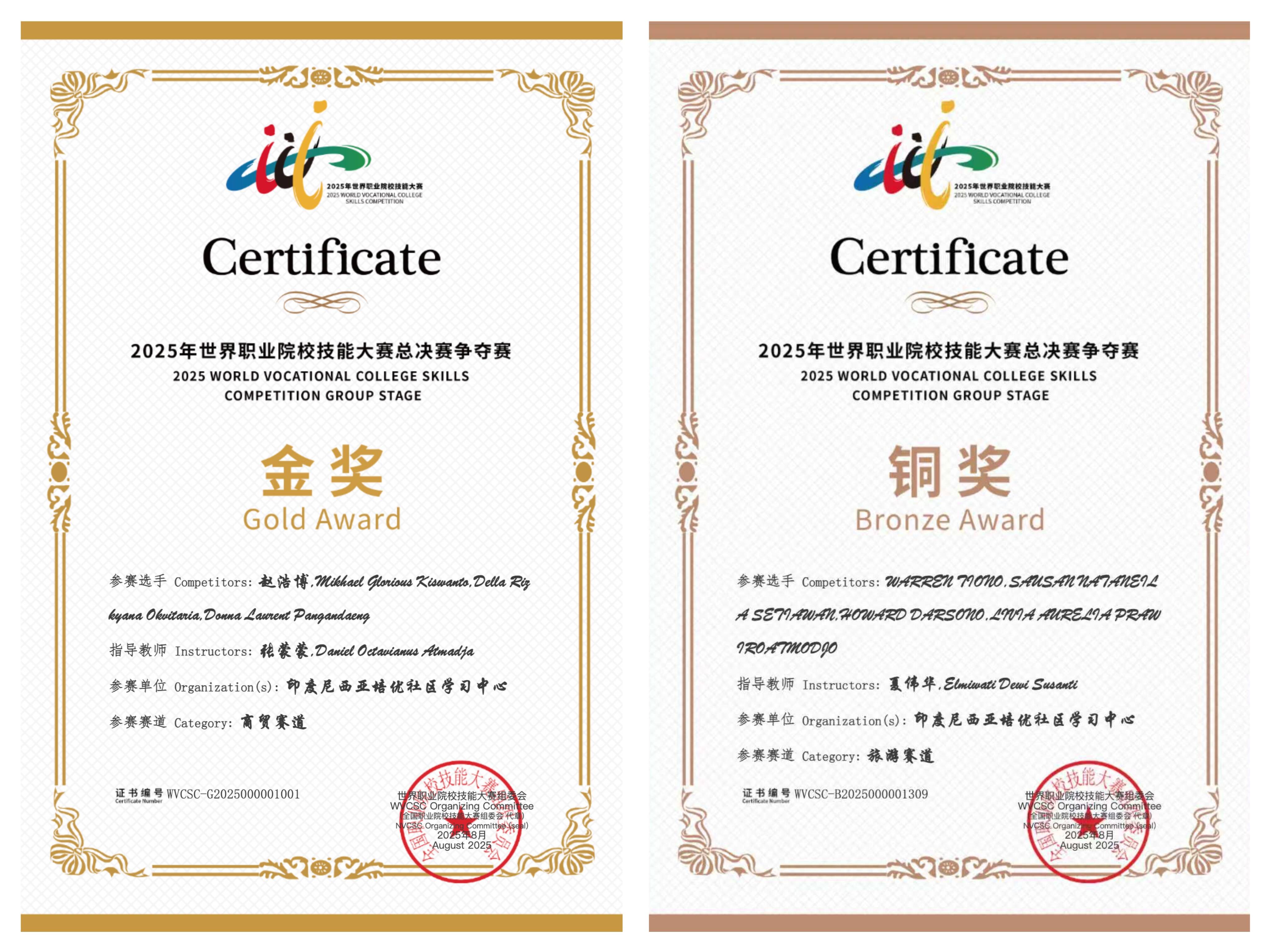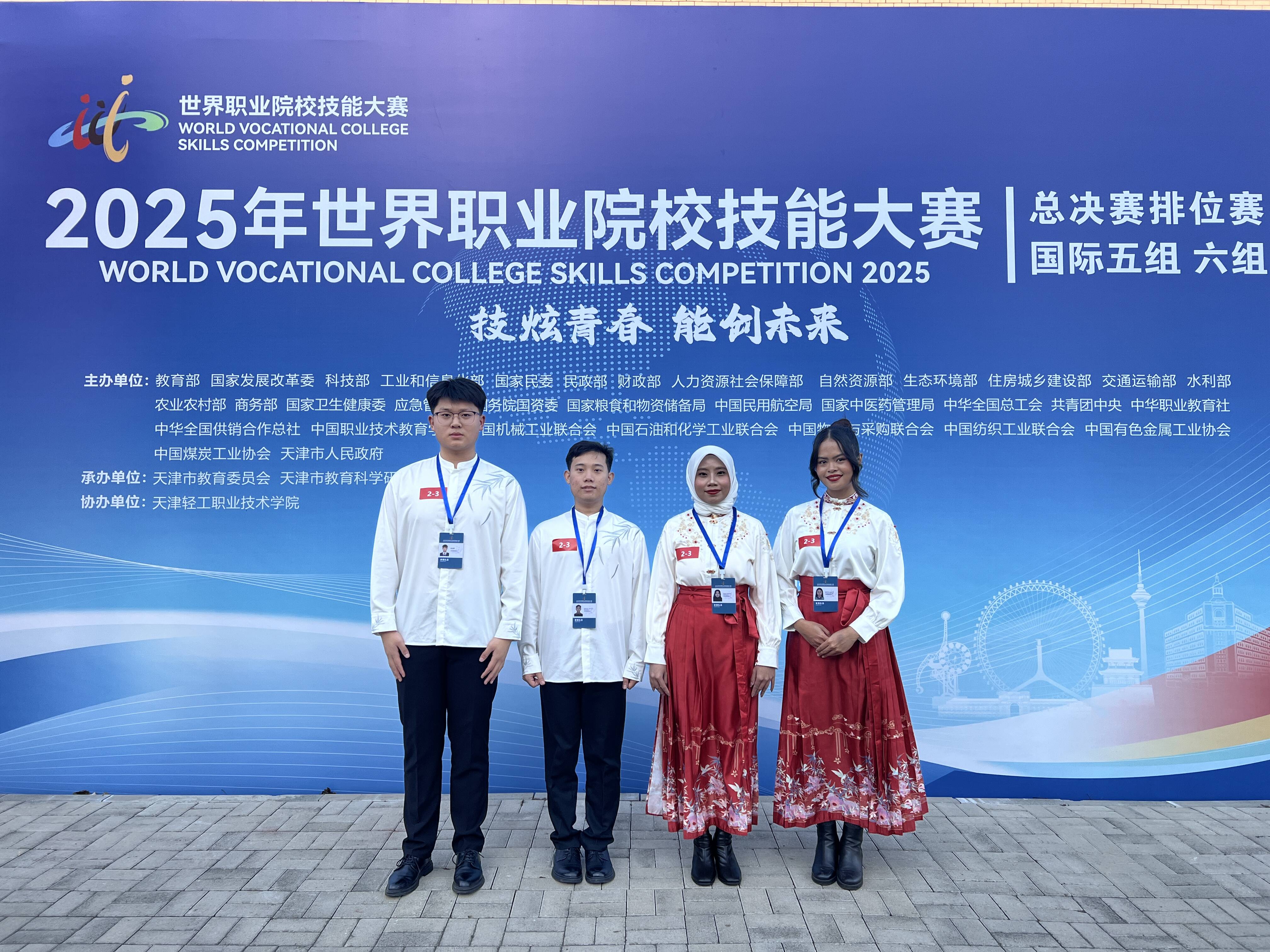据悉,本次大赛吸引了来自全球73个国家的1446名选手,组成了434支参赛队伍,在38个专业赛道中展开了激烈的角逐。我校参赛团队携“数智赋能非遗皮雕手工包出海解决方案”“印度尼西亚火山银龄康养旅游”两个项目出征,分别参加商贸赛道和旅游赛道,其中商贸赛道学生团队是由我校赵浩博和印度尼西亚的国际学生Mikhael Glorious Kiswanto、Della Rizkyana Okvitaria、Donna Laurent Pangandaeng联合组成;旅游赛道团队由印度尼西亚国际学生Warren Tiono、Howard Darsono、Livia Aurelia Prawiroatmodjo、Sausan Nataneila Setiawan参赛。两组参赛团队凭借扎实的专业技能、敏捷的应变能力和高效的团队协作,在激烈的竞争中脱颖而出,延续了我校在国际赛场的优异表现,商贸赛道学生团队再次斩获金奖晋级国际组排位赛,旅游赛道学生首次参赛获得铜奖。我校国际组商贸团队近日赴天津参加排位赛,30支国际代表队的青年学子在此同台竞技,充分展现了职业教育的创新活力和国际化风采。