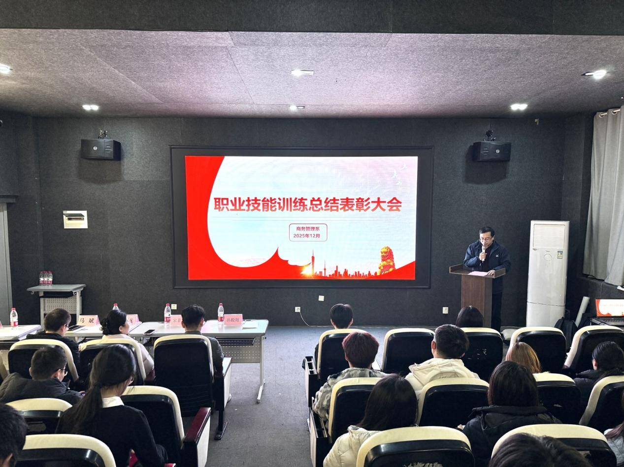 为全面总结2025年下半年职业技能训练成效,表彰先进典型,进一步激发学生钻研专业技能、提升实践能力的热情,12月15日下午,商务管理系在图书馆智慧教室隆重召开职业技能训练总结表彰大会。商务管理系党总支副书记、主任马斌,党总支副书记靳桂龙、副主任夏伟华、企业老师、受表彰学生及部分师生代表参加大会。