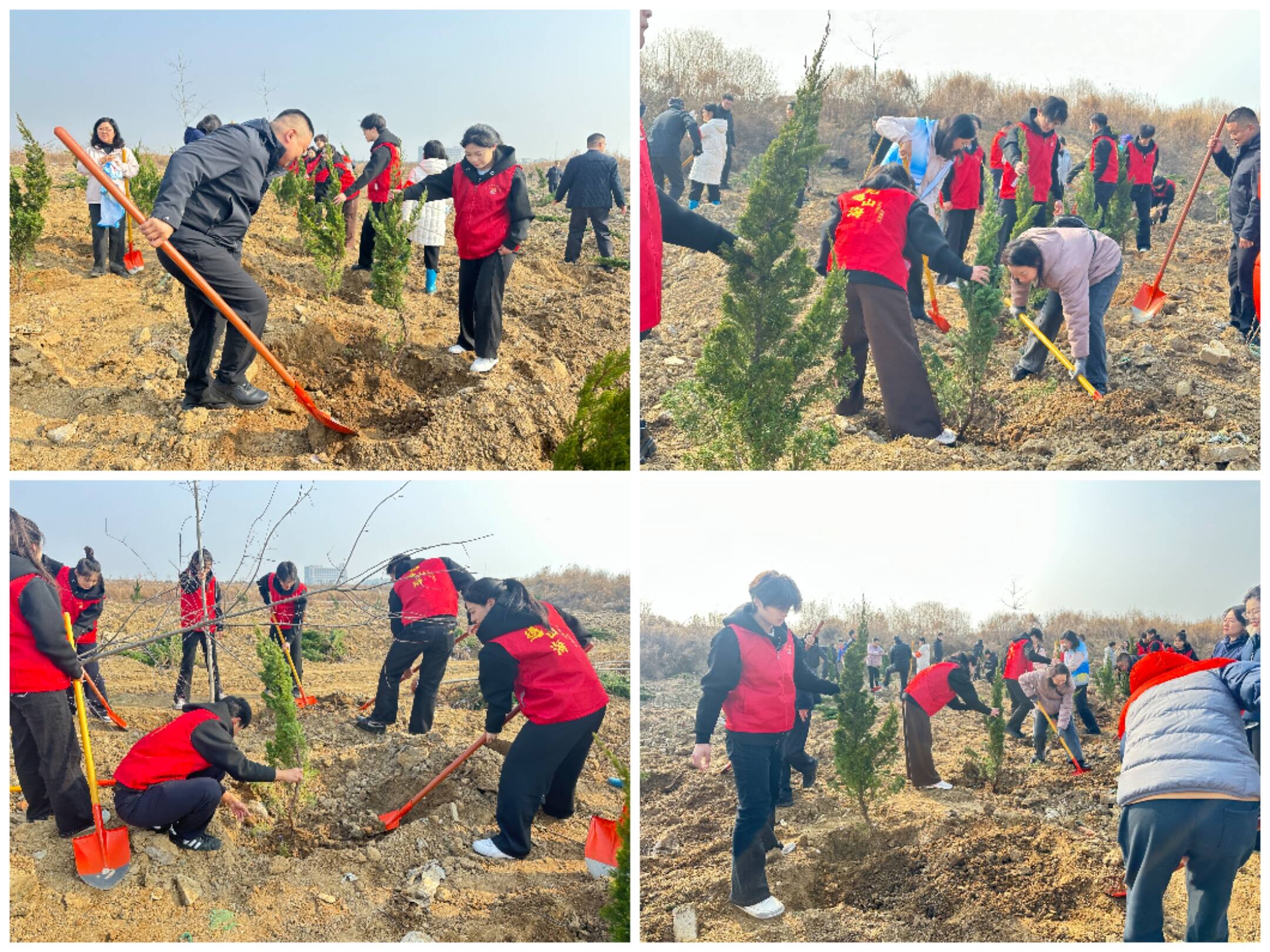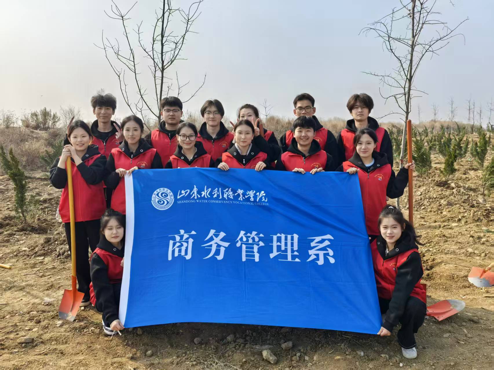 山东水利职业学院“礼遇山海”志愿服务队的 15 名志愿者全程参与活动保障工作,商务管理系学工人员全程跟进指导、贴心帮扶,为志愿服务工作的有序开展保驾护航。志愿者们分工协作、认真负责,前期积极协助森林公园管委完成秧苗分配、植树工具清点整理等准备工作;活动现场,大家挥锹铲土、扶苗培土、提水浇灌,以实际行动投身植树活动;活动结束后,统一完成工具收纳、场地清理等后续工作。志愿者们以细致严谨、高效务实的作风,为本次活动顺利开展提供了有力保障。