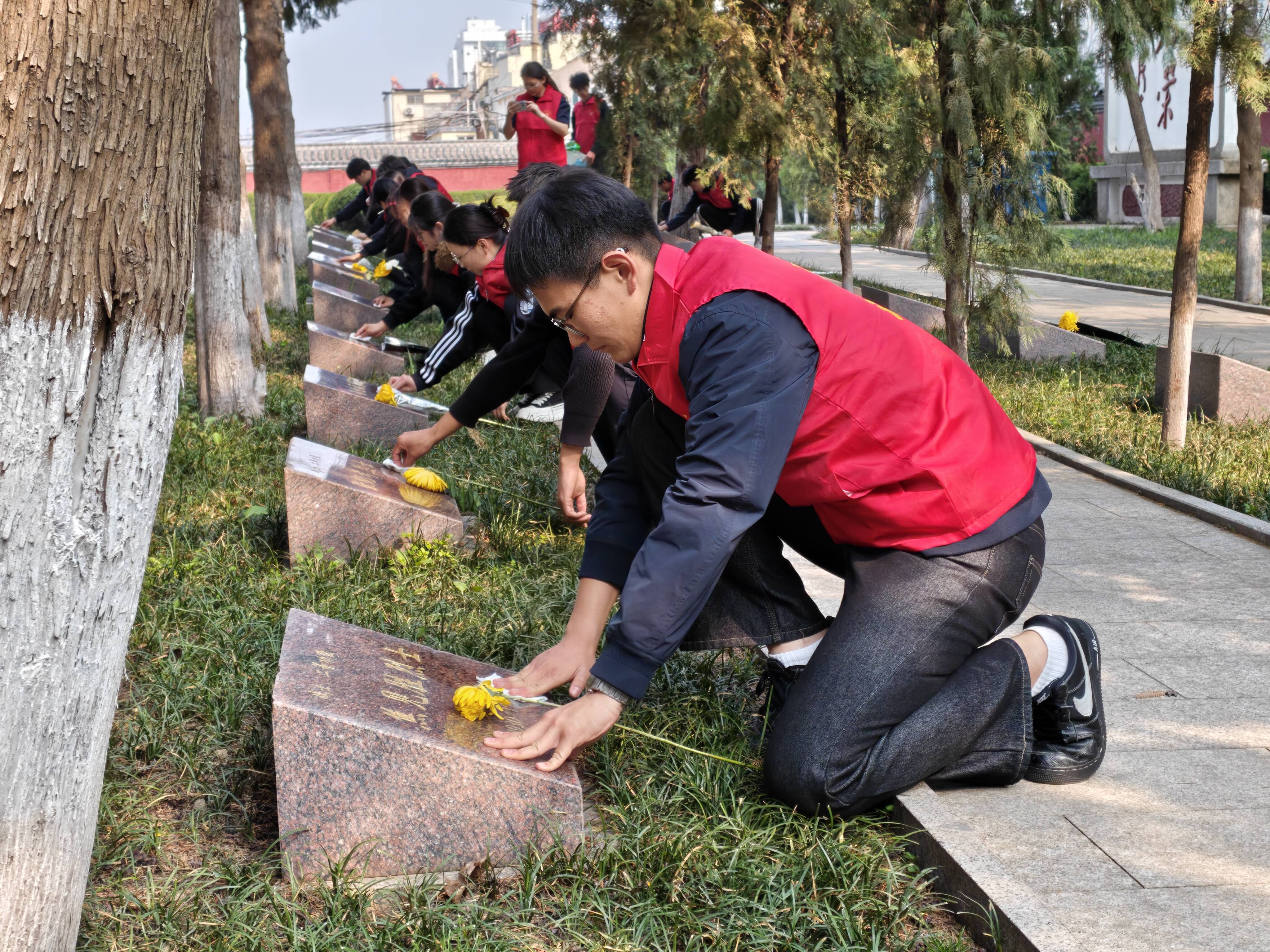 在祭扫现场,志愿者们分工明确、认真投入,率先开展墓碑清洁志愿服务。大家手持抹布认真擦拭每一块墓碑上的灰尘与污渍,仔细清扫墓碑周边的落叶与杂物,动作轻柔细致,用最虔诚的态度守护烈士安息之地,让烈士墓碑洁净如初,尽显对革命先烈的敬重。随后大家整齐列队,向革命先烈默哀、敬献鲜花,以庄重仪式寄托深切哀思,缅怀先烈们的英勇壮举。