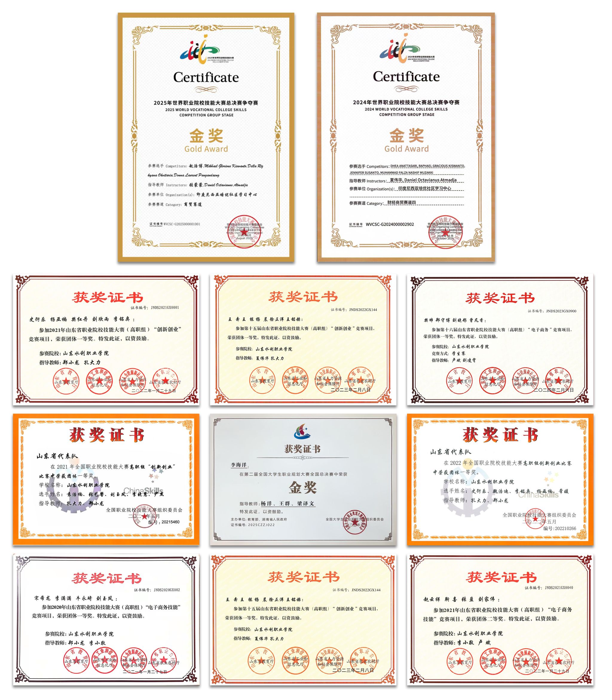专业育人成效显著,学生在技能竞赛、创新创业大赛等赛事中屡创佳绩。2024年、2025年连续两年夺得世界职业院校技能大赛商贸赛道金奖;2025年荣获全国大学生职业规划大赛总决赛金奖;2021年、2022年蝉联全国职业院校技能大赛“创新创业”赛项一等奖;2021年荣获中国“互联网+”大学生创新创业大赛银奖;2020年荣获中国国际“互联网+”大学生创新创业大赛铜奖;2018年至2023年在山东省职业院校技能大赛“电子商务技能”赛项中获一等奖2项、二等奖2项、三等奖2项;2018年至2025年在山东省“互联网+”大学生创新创业大赛中获金奖3项、银奖5项、铜奖8项。