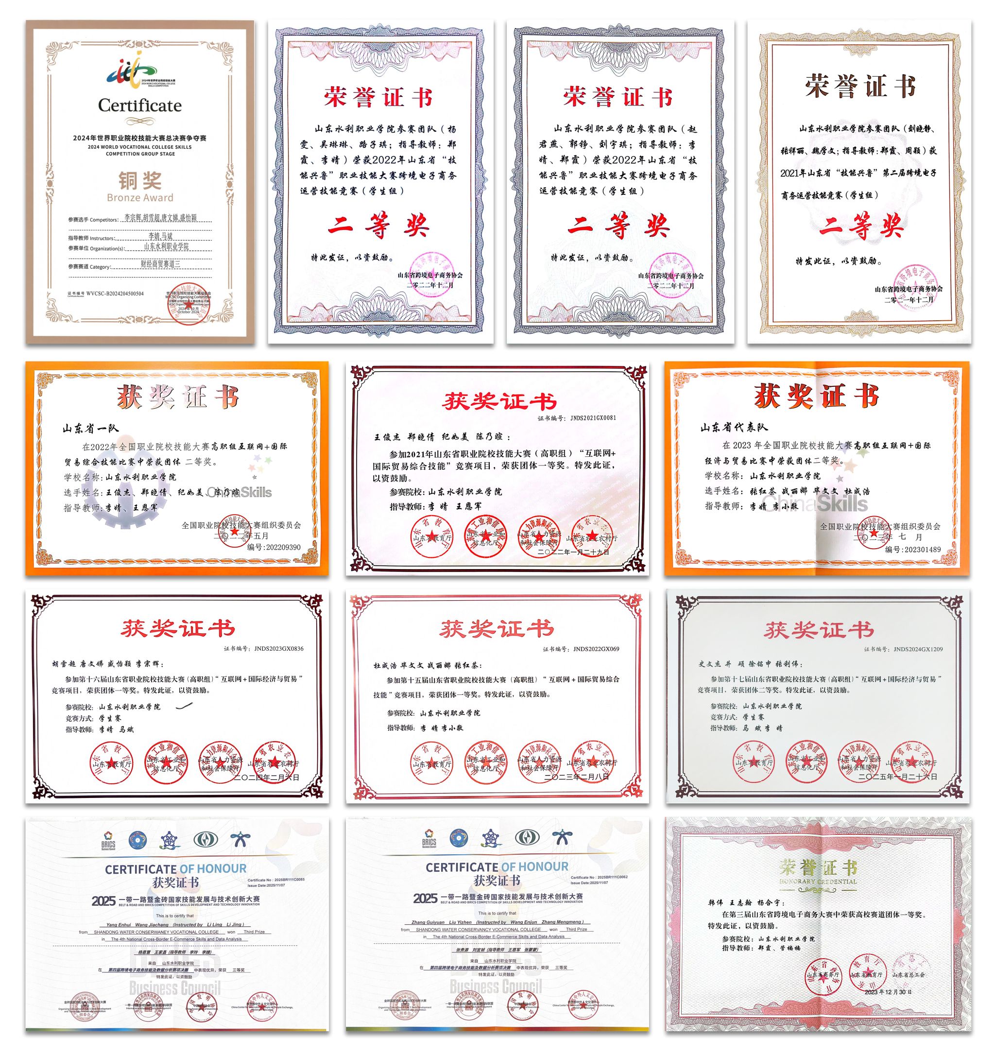 跨境电子商务专业育人成果显著,学生在技能与学科竞赛中表现突出。近年来,先后获得2024年世界职业院校技能大赛总决赛争夺赛铜奖1项、全国职业院校技能大赛高职组“互联网+国际经济与贸易”赛项二等奖2项、2025一带一路暨金砖国家技能发展与技术创新大赛三等奖2项、山东省职业院校技能大赛“互联网+国际经济与贸易”赛项一等奖3项及二等奖1项、第三届山东省跨境电子商务大赛一等奖1项、中国电商主播大赛(华东赛区)跨境电商赛道二等奖等多项奖项。