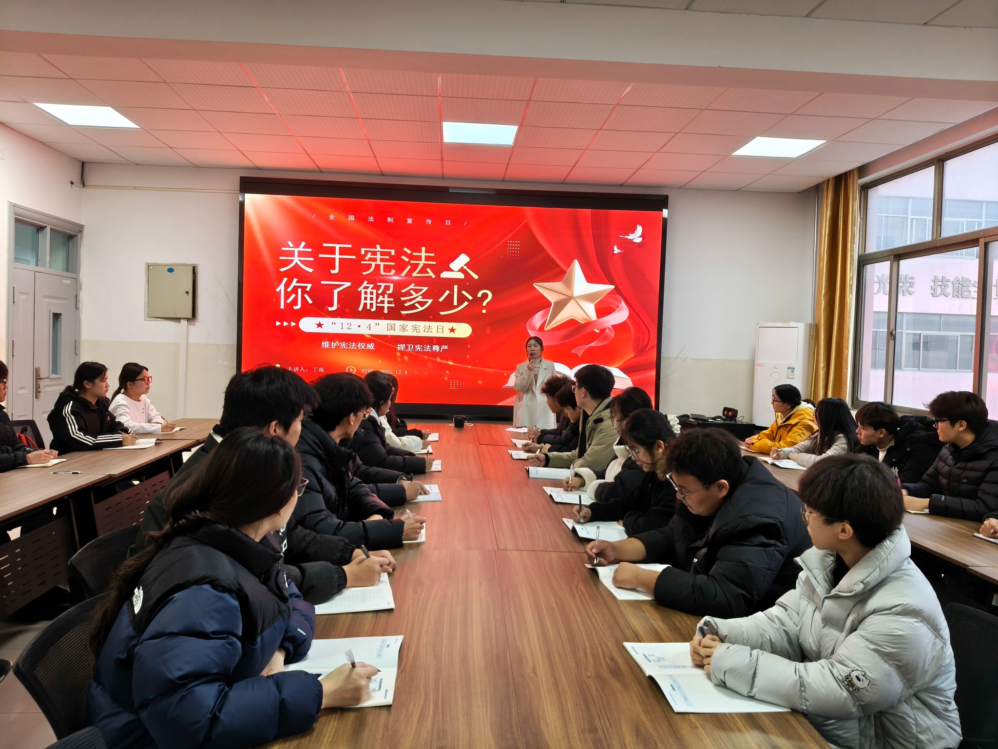 为深入学习贯彻习近平法治思想,增强青年学生的宪法意识,在我国第十二个“国家宪法日”来临之际,我系初心学社邀请思想政治课教学部丁老师开展“宪法知识”主题宣讲活动,社团全体成员及“青马工程”学员参加。