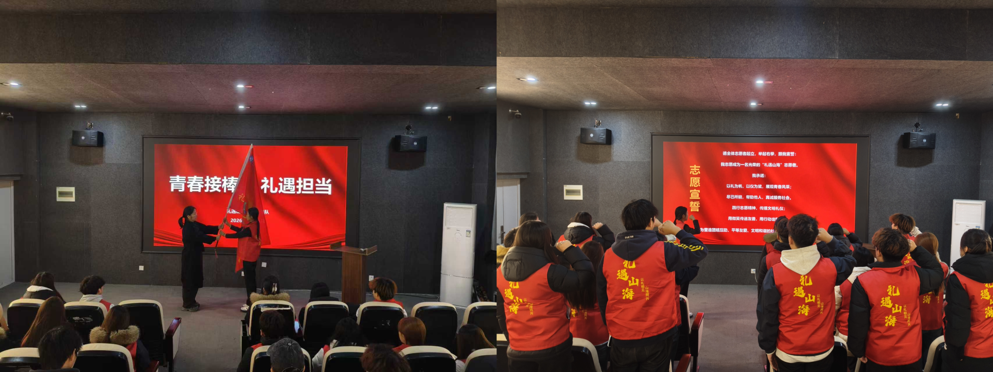 仪式环节中,志愿者服务队负责人为礼遇山海志愿服务队授旗,鲜红的队旗承载着“礼遇山海、传递文明”的使命,标志着服务队正式迈入规范化、专业化服务新阶段。授旗结束后,全体志愿者起立举起右拳庄严宣誓,铿锵誓言彰显着践行“奉献、友爱、互助、进步”志愿精神的坚定决心,也传递着以礼仪规范服务、以专业助力发展的责任担当,将现场氛围推向高潮。