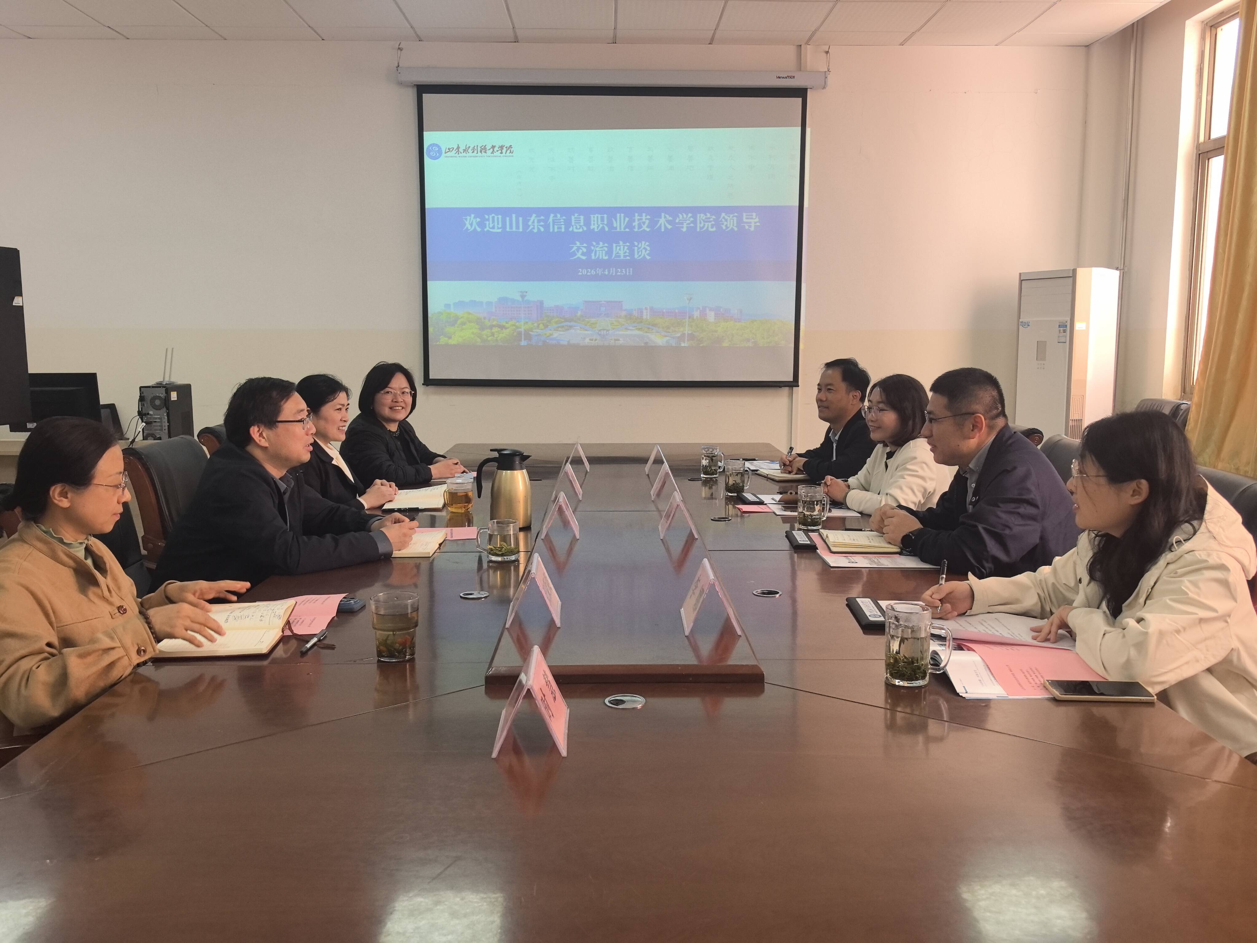 4月23日,山东信息职业技术学院经济与管理系副主任尹波带队一行四人到访山东水利职业学院商务管理系,就专业建设、产教融合及国际化发展等议题进行深入交流。山东水利职业学院商务管理系主任马斌及相关专业教师参加座谈。
