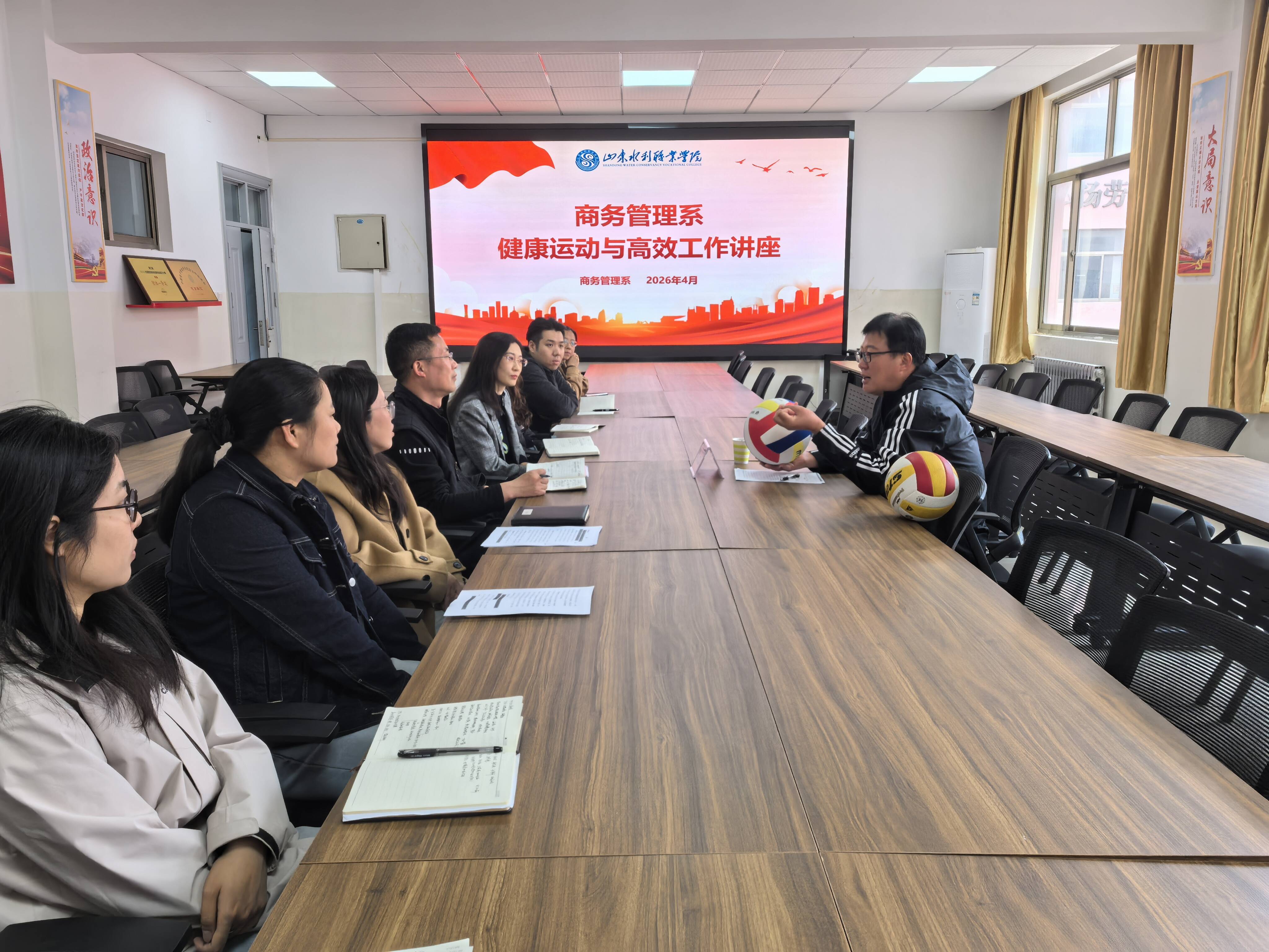 为丰富教师课余生活,倡导健康生活理念,引导广大教师以强健体魄和饱满状态投身教育教学,4月22日,商务管理系特邀水利工程系党总支副书记莅临我系,开展“健康运动与高效工作”排球知识专题培训。