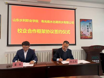 活动期间,山东水利职业学院产教融合发展中心主任董科与寿光南水北调供水有限公司董事长肖玉东代表双方签订校企合作框架协议。林艳斌副院长与肖玉东董事长共同为“供水技术协同创新基地”揭牌,并合影留念。