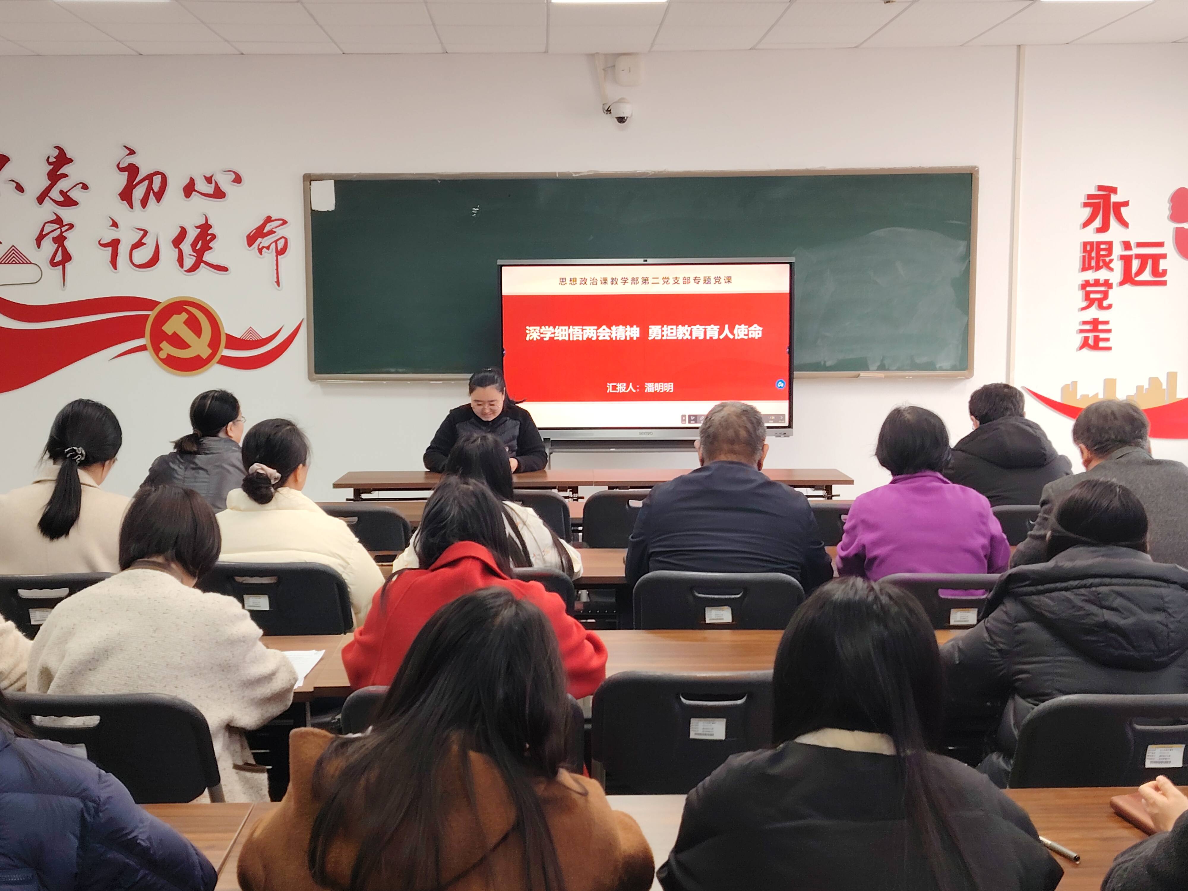 为深入学习贯彻全国两会精神,切实将党的最新理论成果和战略部署融入思想政治理论课教学,提升思政课教师的政治素养与育人能力,3月24日,思想政治课教学部第二党支部举办了支部书记讲党课活动。支部全体党员参加。