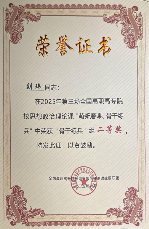 学院教师获得2025年第三场全国高职高专院校思想政治理论课“萌新磨课 骨干练兵”中荣获“骨干练兵”组二等奖