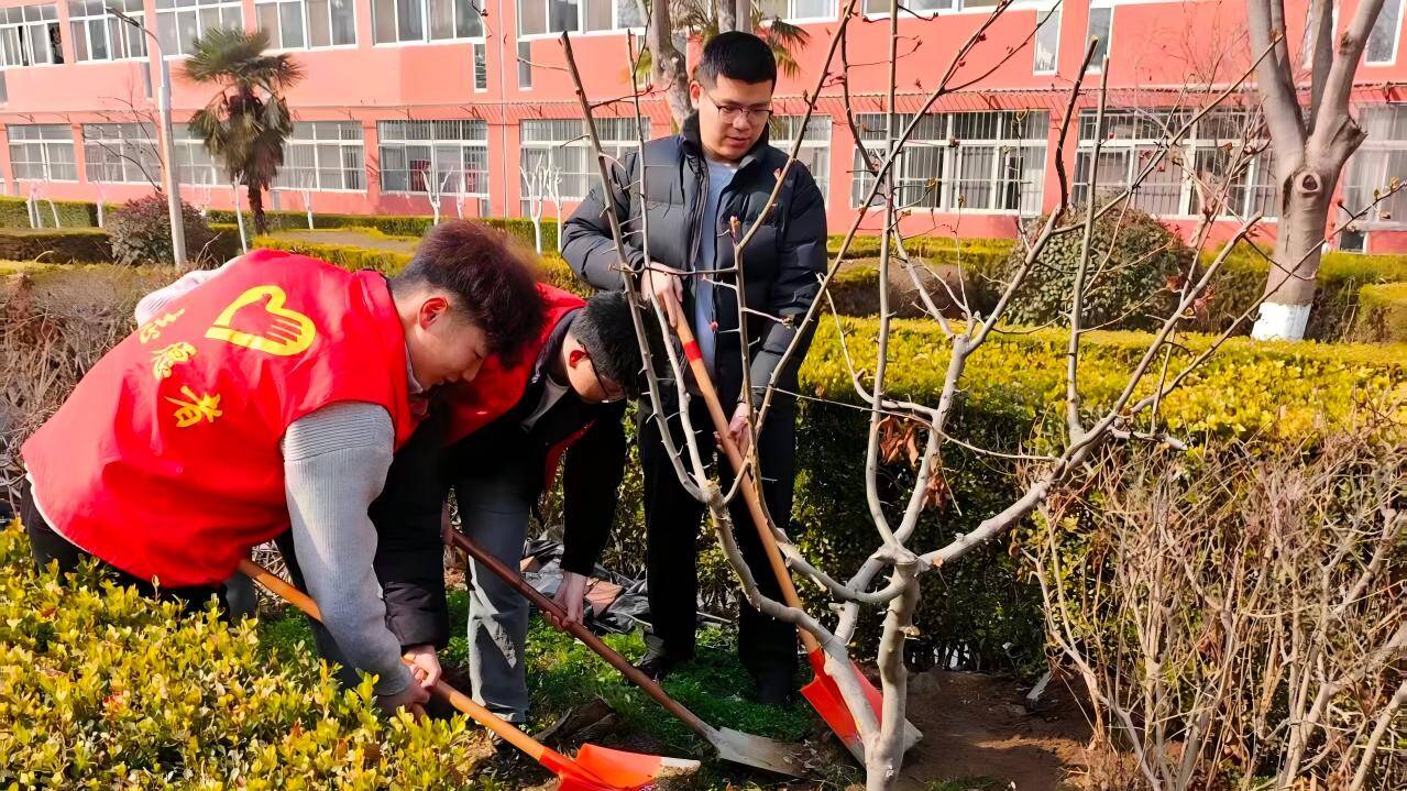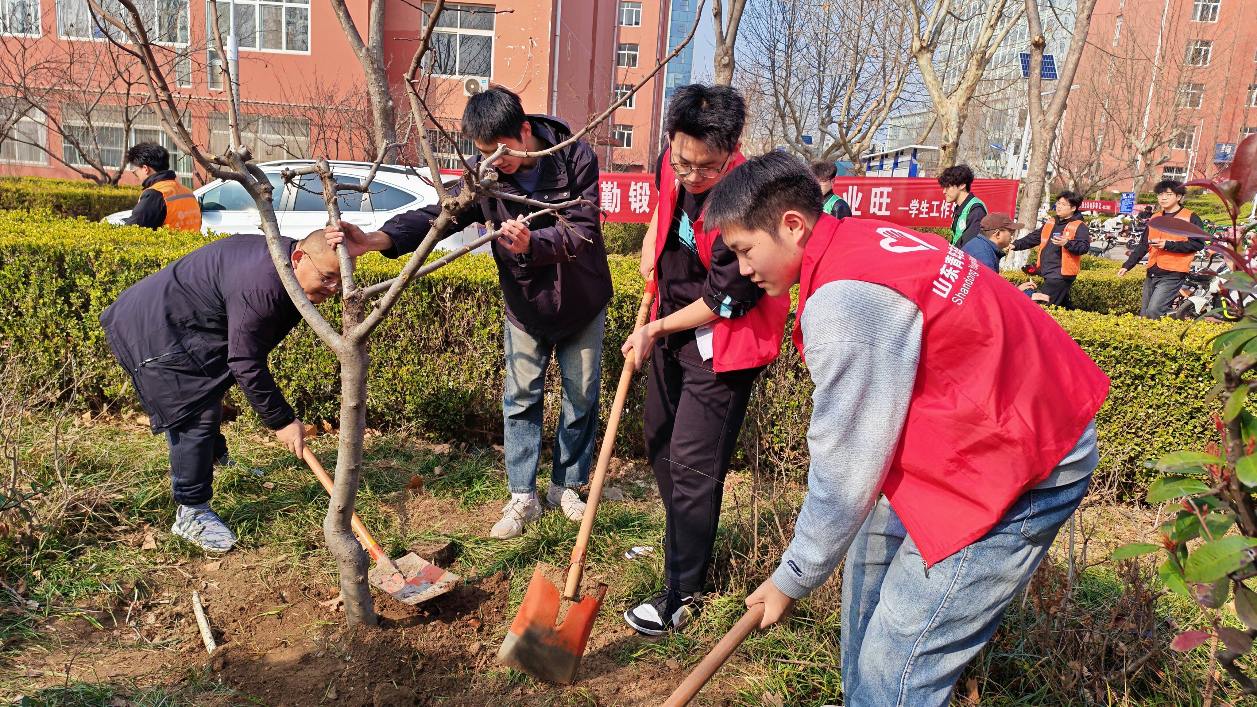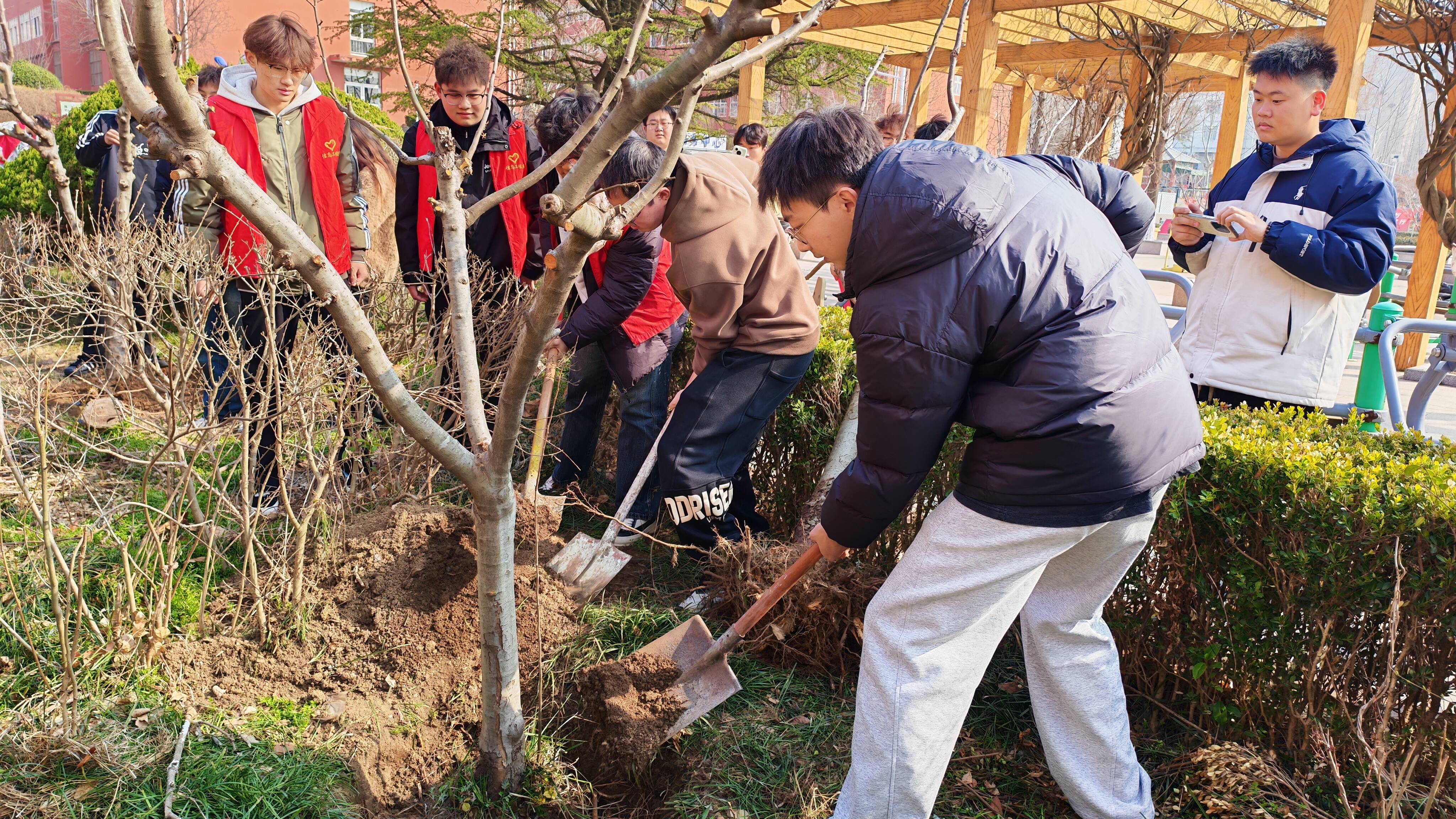 活动现场气氛热烈而有序。师生们分工协作,挥锹挖坑、扶苗定植、培土浇水,每一个环节都认真细致、一丝不苟。大家热情高涨,干劲十足,配合默契,现场不时传来阵阵欢声笑语,洋溢着青春的朝气与劳动的快乐。阳光下,新栽的树苗迎风而立,为原本整洁的宿舍园区增添了几分生机与绿意。