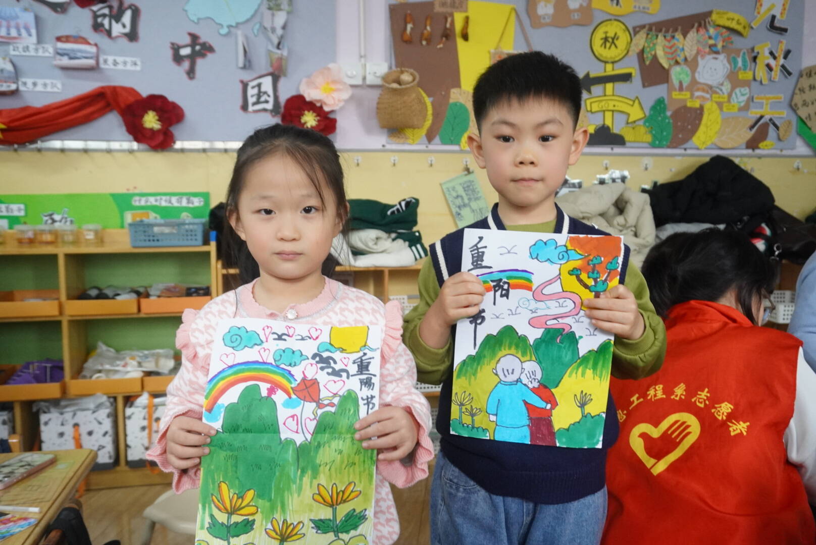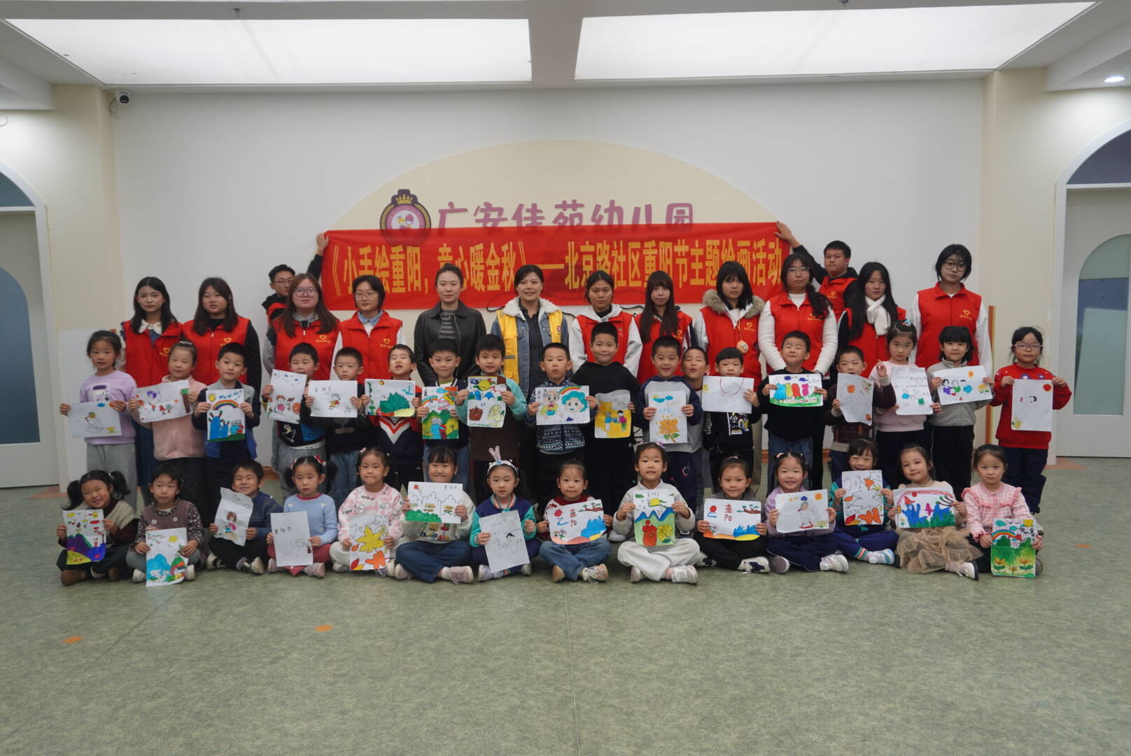 创作环节结束后,孩子们自豪地展示了与志愿者哥哥姐姐共同完成的画作。每一幅作品都是童心与爱心碰撞的结晶,是重阳节最真挚的献礼。活动最后在欢乐的集体合影中落下帷幕。