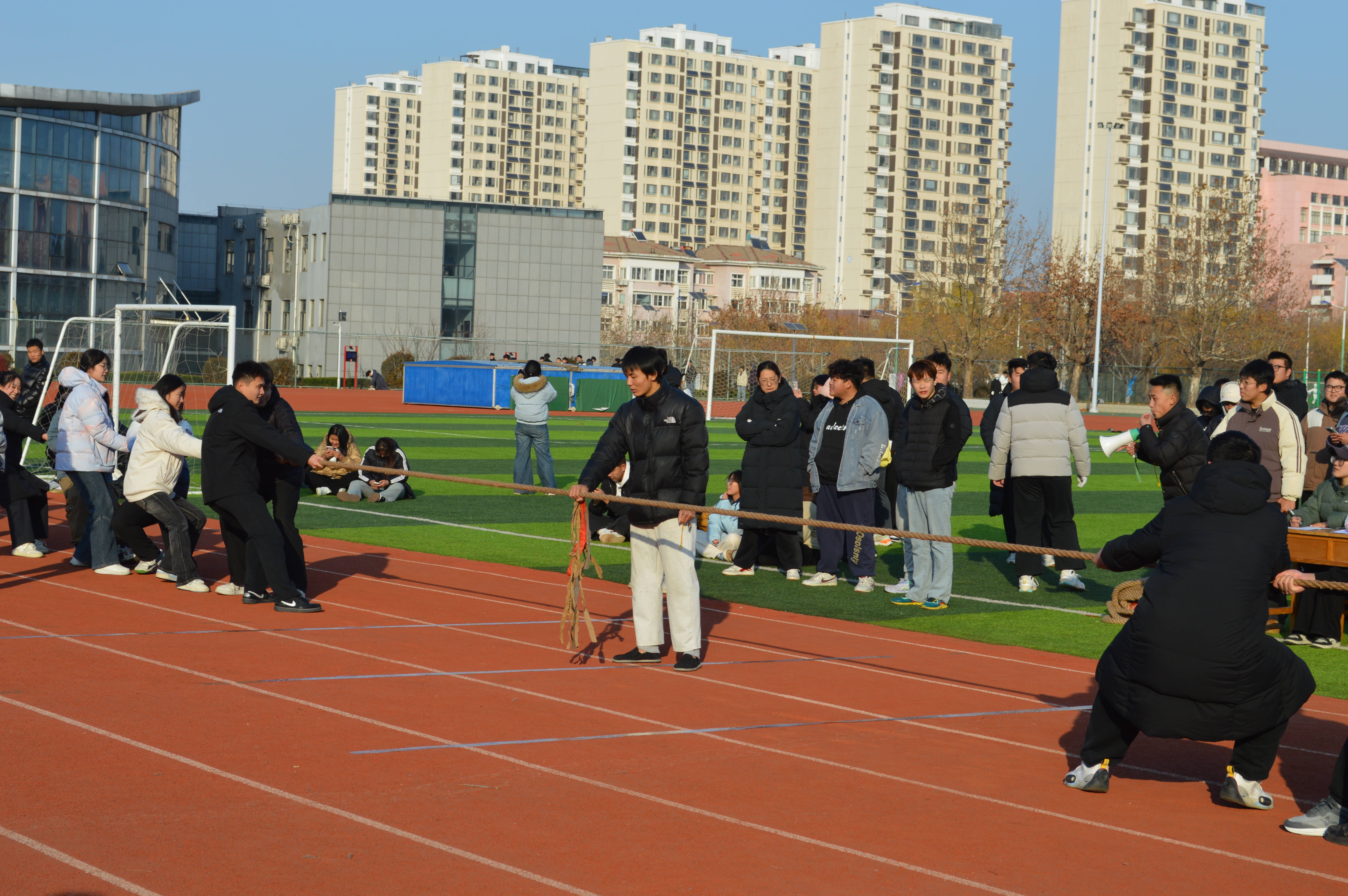 比赛现场气氛热烈,口号声、助威声此起彼伏。各参赛队伍精心排兵布阵,队员们紧握长绳,扎稳马步,身体后倾,凝心聚力。随着裁判员一声哨响,双方队员立即投入激烈的对抗中,心往一处想,劲往一处使,全力以赴,寸土必争。长绳中点的红线在双方界线上来回移动,胜负往往在毫厘之间,赛况紧张激烈,扣人心弦。场边各系的啦啦队热情高涨,呐喊助威声浪一浪高过一浪,为寒冷的冬日注入了无限的青春活力。