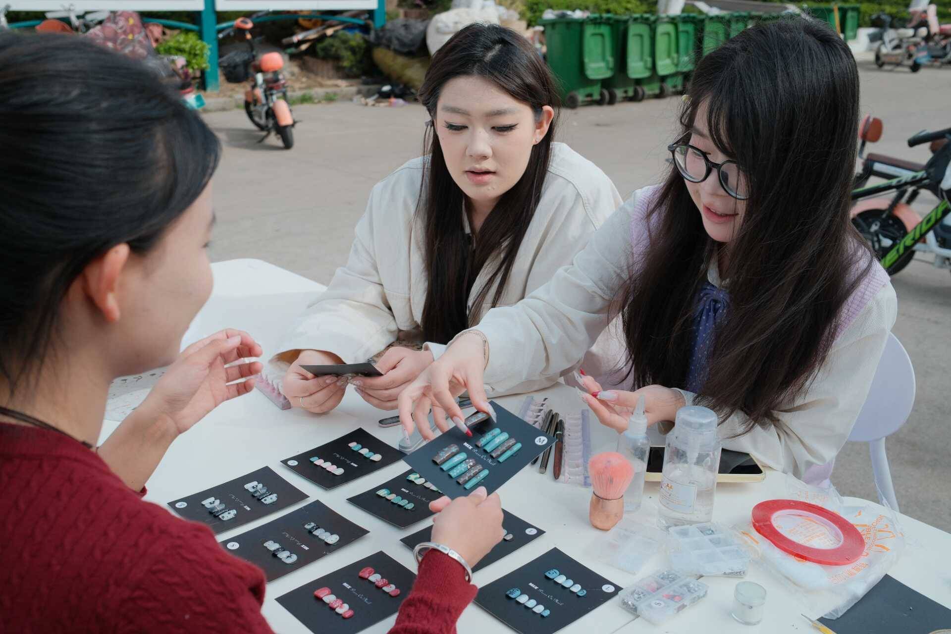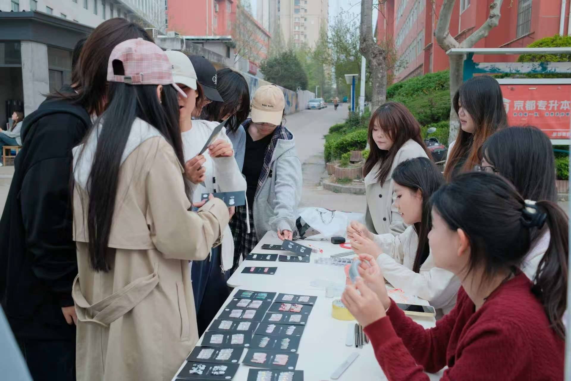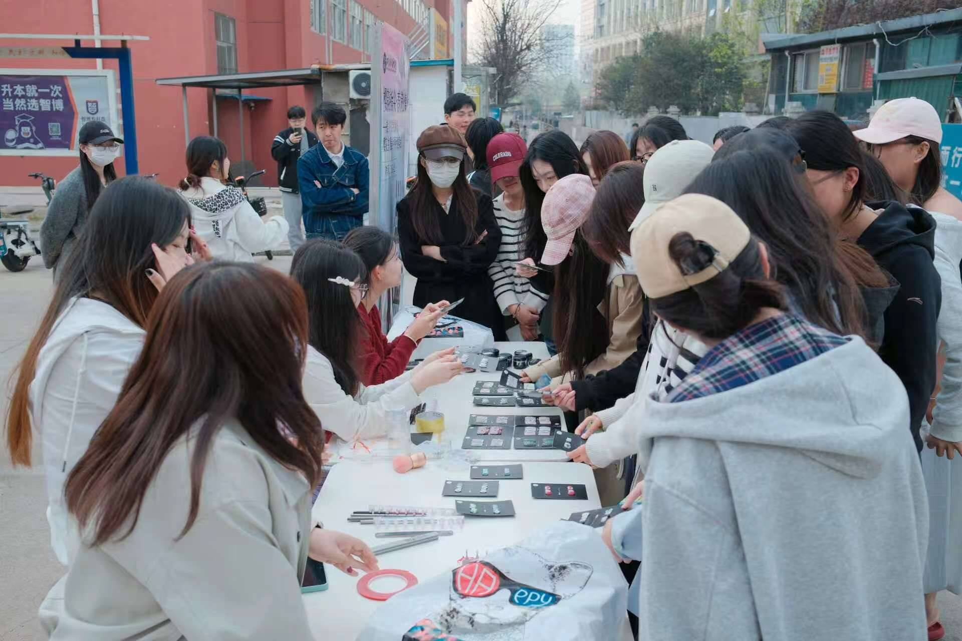 市集焕彩,温情互动。活动当天,公寓社区中心广场被精心布置,以粉色、白色为主的装饰与樱花主题美甲交相辉映,营造出温馨浪漫的春日氛围,展示区、体验区划分清晰、秩序井然。学社成员佩戴工作牌,以饱满的热情接待每一位过往学生,细致介绍美甲作品的设计理念、创作思路与佩戴方法,耐心解答同学们关于美甲材质、佩戴时长等各类疑问,并贴心提供免费试戴服务,用专业的态度与真诚的服务赢得了同学们的一致好评。活动现场人头攒动、氛围热烈,同学们踊跃参与,或驻足欣赏、交流点评美甲作品,或精心挑选心仪款式,在轻松愉悦的氛围中感受春日美好与手工魅力。