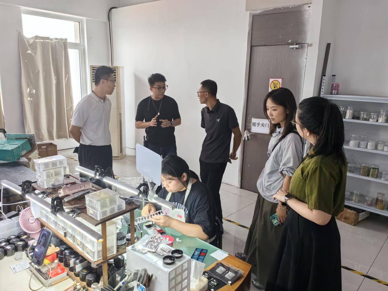 尹成一行实地参观了企业生产车间、产品研发线和设计部门,详细了解了穿戴甲产品的工艺流程、技术特点及市场发展前景。企业负责人介绍了公司在人才培养、岗位能力建设等方面的具体实践,并展示了企业在创意设计、数字化生产等领域的核心优势。
