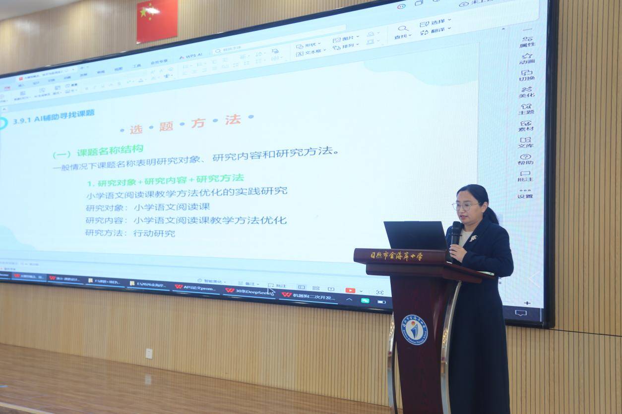培训中,迟浩结合自身在人工智能领域的深厚理论功底与丰富的实操经验,为金海岸小学教育集团的教研组长、区级以上骨干教师及中层管理人员带来了一场内容详实、实用性强的讲座。她摒弃了晦涩难懂的理论阐述,紧密围绕小学教育教学的实际场景,从课题研究到智慧工具选择,逐一讲解了大模型的实操方法与应用技巧。