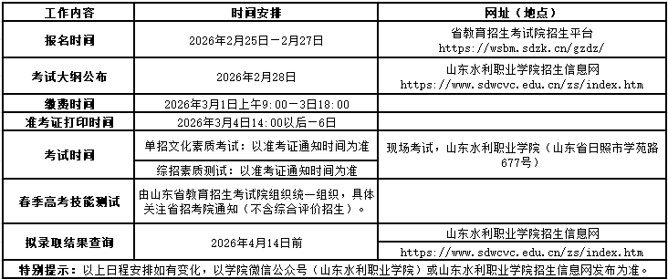 报名时间为2026年2月25日—2月27日,考生需登录山东省教育招生考试院招生平台选报学校和专业(网址:https://wsbm.sdzk.cn/gzdz/)。选择我校及一个专业志愿,无服从调剂选项(每位考生仅能选择1所学校报名)。