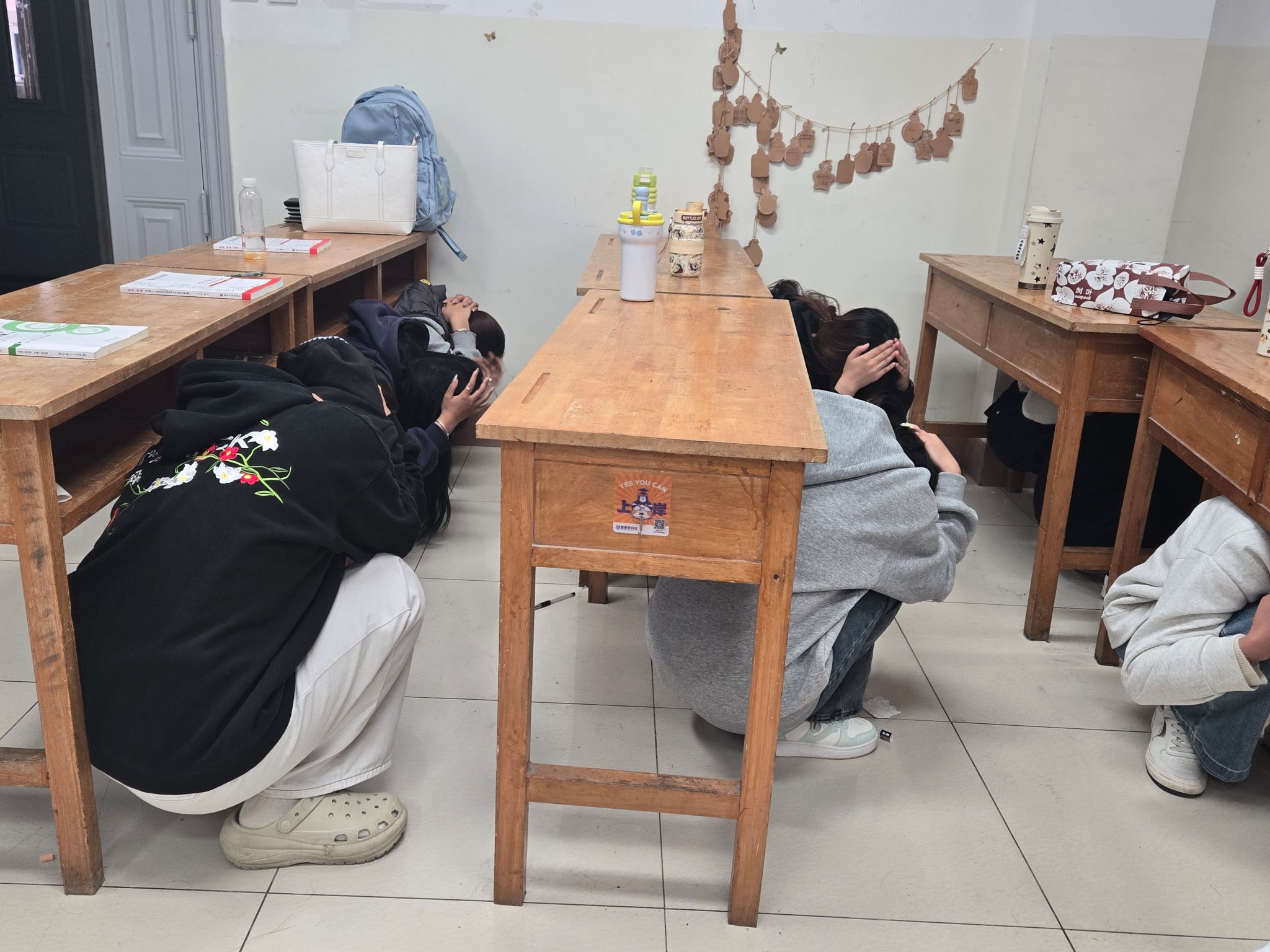 在防震知识学习环节,辅导员结合多起真实地震案例,向学生系统讲解地震发生时的应急应对措施、避险要点及自救技巧,将抽象的安全知识转化为具象可操作的方法。进入防震实战演练环节后,师生全员高度投入,严格践行“伏地、遮挡、手抓牢” 核心避险规范。当第一次地震警报准时响起,参与演练的学生第一时间启动应急响应:双手紧紧护住后脑,身体快速蜷缩至课桌下方,保持规范姿势等待指令;30 秒后,第二次警报响起,疏散指令同步发布。各楼层预安排的安全员迅速到岗,依规引导学生撤离,严格落实“低层先行、错时疏散” 原则,有效规避拥挤踩踏风险。在全体师生默契配合、高效协作下,防震演练流程紧凑、秩序井然,顺利达成既定目标。