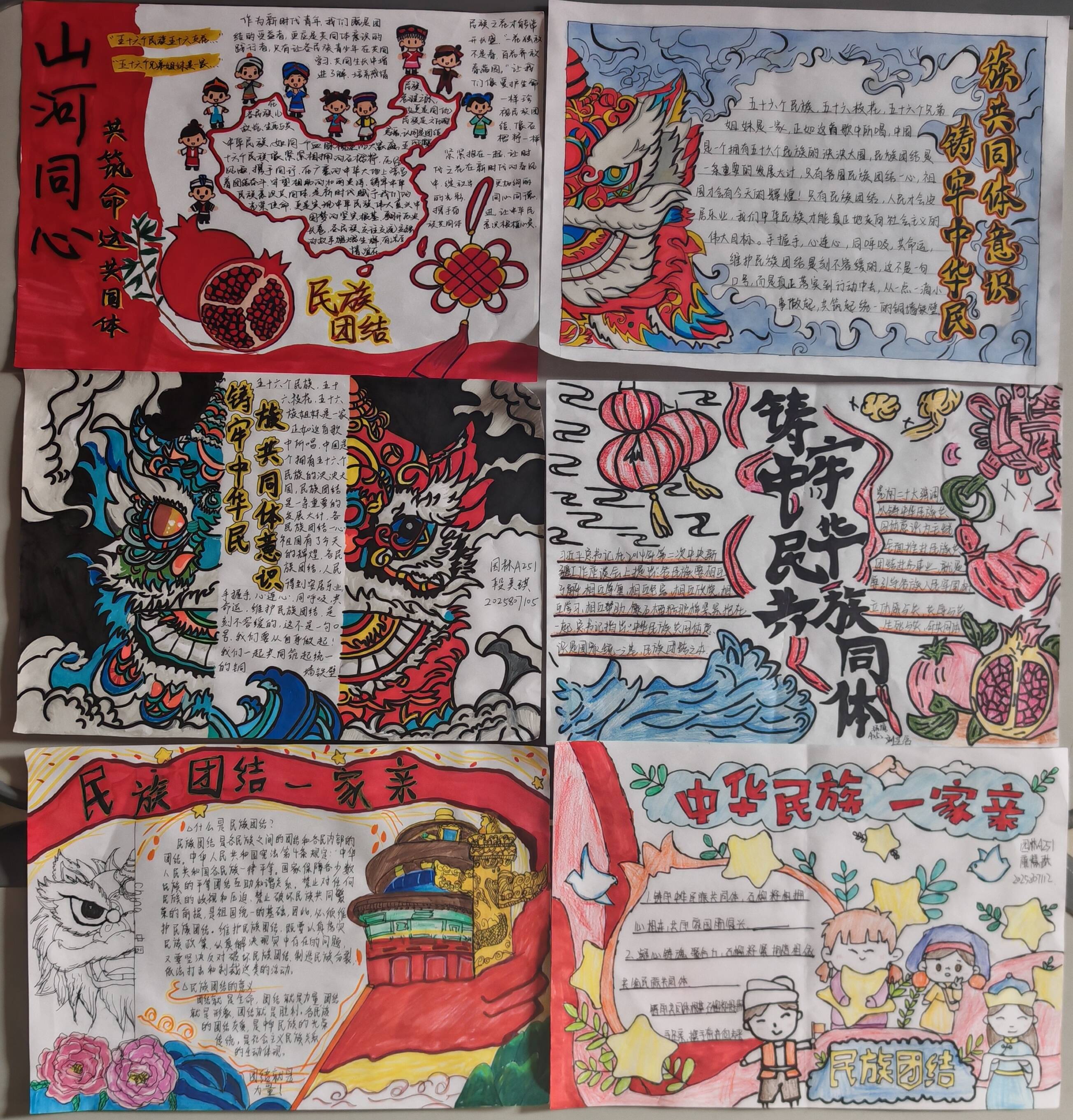 组织开展 “民族团结一家亲”主题手抄报创作展示活动,鼓励同学们发挥想象力与创造力,以画笔绘团结、以文字寄深情。活动共征集到作品 86 幅,精选 30 幅优秀作品在校园文化长廊集中展示。作品中,有的融入各民族传统服饰、节日习俗等文化符号,有的描绘各族人民共庆佳节、携手奋斗的场景,有的以书法形式书写民族团结名言警句,主题鲜明、色彩绚丽,生动展现了 “中华民族一家亲、同心共筑中国梦” 的美好愿景。