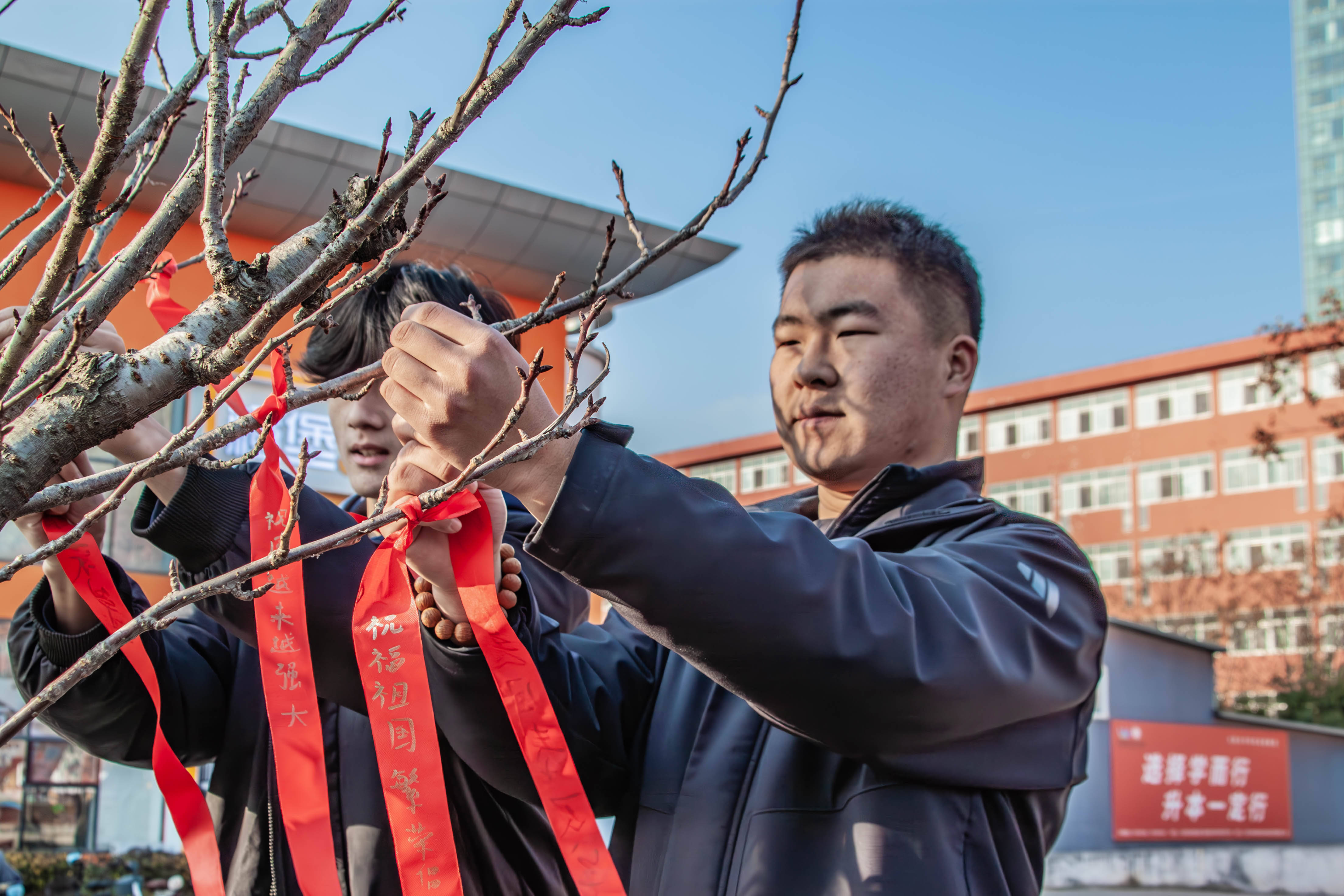 历史长廊参观后,活动进入“书写祈愿,共创未来”环节。学子们满怀对祖国的赤诚与对和平的向往,在祈福带上郑重写下对祖国繁荣昌盛、民族永续发展的美好祝愿。数百条承载着青年爱国情怀与和平期许的红绸,被依次系于历史长廊两侧的树枝上,形成一道鲜红的精神风景线,生动展现了新时代青年将个人理想融入民族复兴伟业的坚定信念与责任担当。