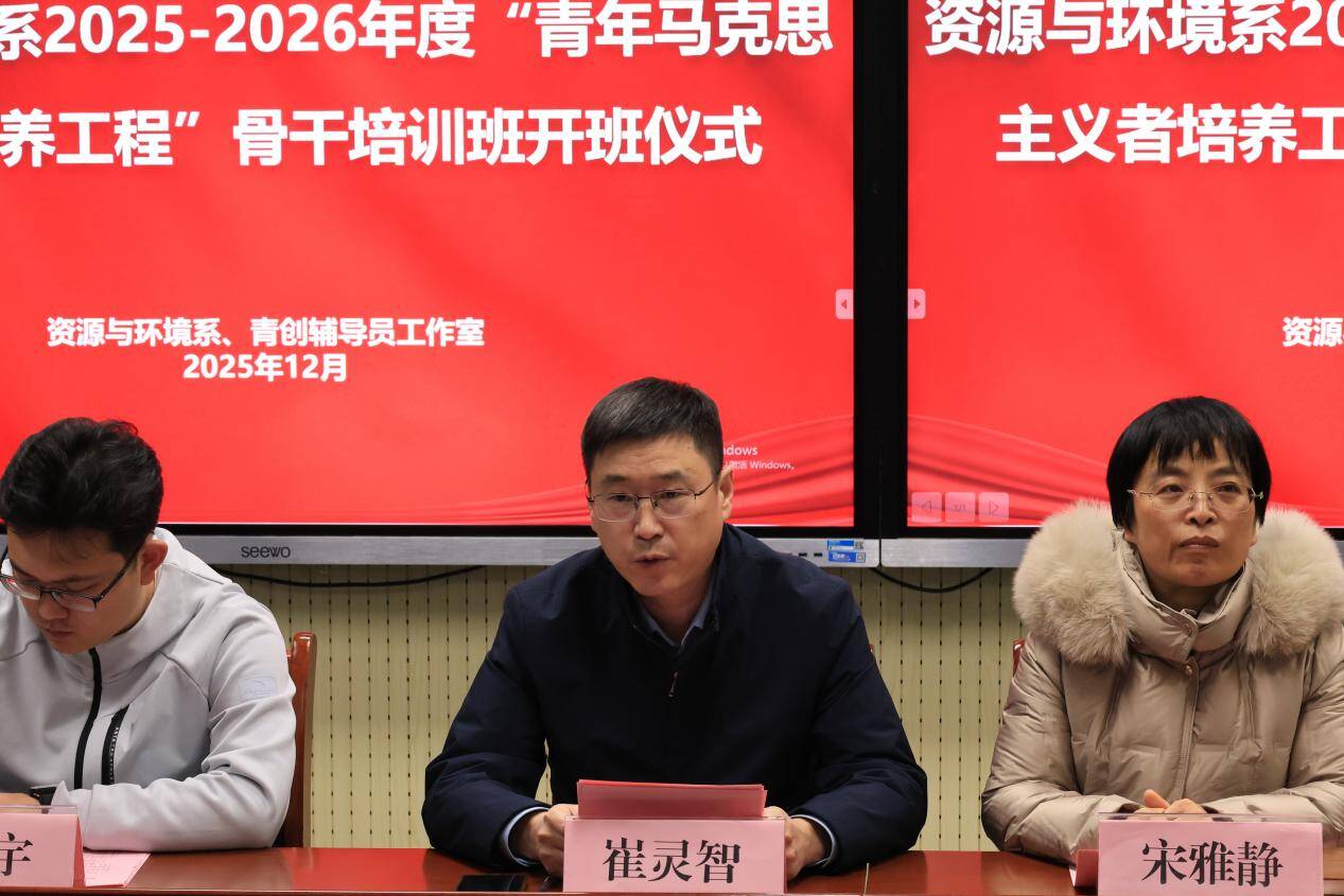 12月15日下午,资源与环境系2025-2026年度“青马工程”大学生骨干培训班在教学楼7221教室顺利举行。系党总支书记崔灵智、全体学工人员及培训班全体学员参加活动。活动由系党总支副书记主持。