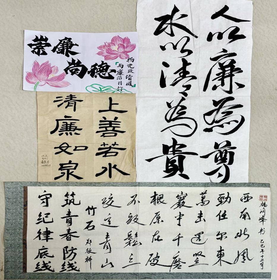 “笔绘红线・墨润清风”书法美育暨纪律宣传活动中,同学们挥毫泼墨,以楷书、行书等多样字体,书写“守纪律底线,筑青春防线”等标语及水利行业廉洁名言。作品版式简洁雅致,兼具书法美学魅力与廉洁教育意义。优秀作品经筛选装裱后在纳贤楼北楼走廊展出,打造出独具特色的“纪检美育书法墙”,让师生在驻足观赏、细细品味中接受廉洁文化熏陶,实现美育与德育的同频共振。